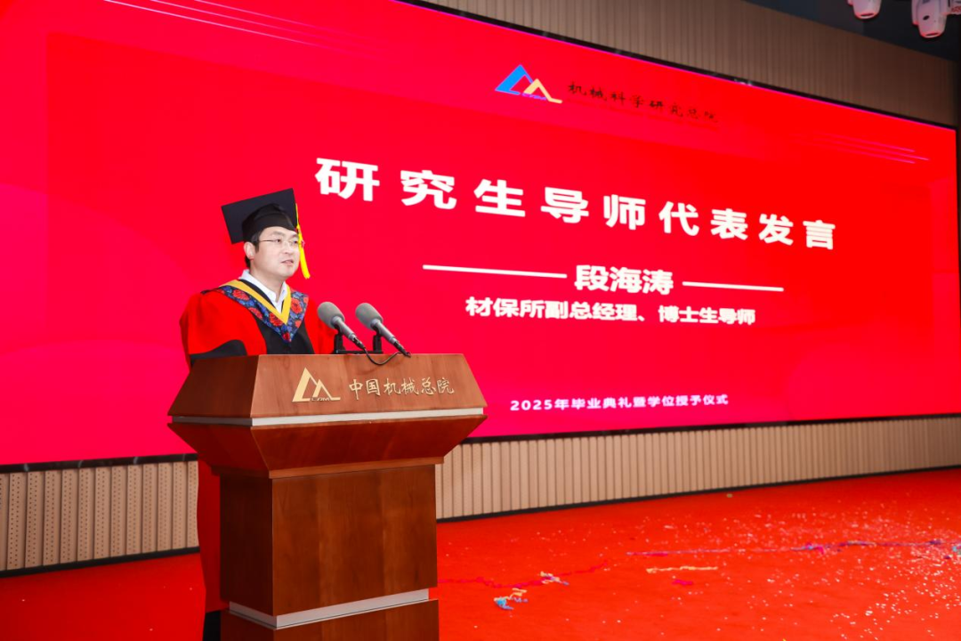 材保所副總經(jīng)理、博士生導(dǎo)師段海濤作為導(dǎo)師代表發(fā)言,為全體畢業(yè)生送上囑托和期望。他希望同學們樹立“大志向”、堅守“大擔當”、秉持“大情懷”,用真才實學鐫刻屬于自己的璀璨印記。